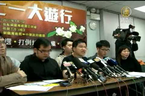 【新唐人亞太台2011年4月5日訊】香港民間人權陣線星期一(4號)宣佈,今年七一遊行的主題,將是還我2012雙普選、打倒地產霸權以及首次要求行政長官曾蔭權下臺。民陣強調,香港政治發展陷入困境,市民民怨沸騰,曾蔭權應該立即下臺,向市民交代。