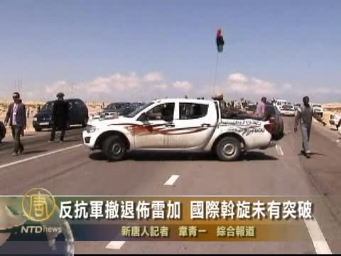 【新唐人2011年4月6日訊】星期二(4月5日),利比亞反抗軍與政府軍在東部石油重鎮佈雷加(Brega)的拉鋸戰進入第六天,反抗軍再次被卡扎菲軍擊退。這是反抗軍幾天來最大的撤退。同時,斡旋雙方停火的土耳其表示,不會很快出現突破,雙方立場都很堅決。