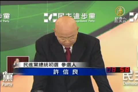 【新唐人亞太台2011年4月9日訊】再來看到民進黨總統初選第一場電視政見發表會今天(9日)下午兩點在台北國際會議中心正式登場,三位參選人蘇貞昌、許信良及蔡英文公開闡述各自的政治理念與對台灣的未來願景。蘇貞昌訴求如何增加人民的幸福感,蔡英文強調將翻轉治國軸線創造台灣藍海,許信良則是凸顯社福政策。