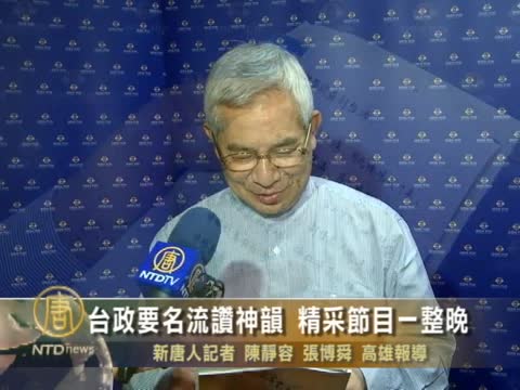【新唐人2011年4月9日訊】8號夜晚,美國神韻國際藝術團高雄場的第四場演出,座無虛席,當一幕幕壯觀、殊勝場景呈現觀眾眼前,現場掌聲如潮,歡聲雷動。前行政院南部聯合服務中心執行長尤宏說,自己是神韻的忠實觀眾,還特地為神韻作了一首詩。