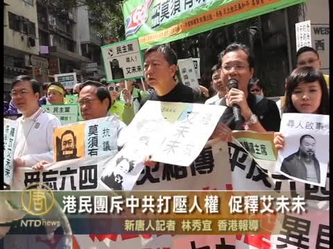 【新唐人2011年4月11日訊】大陸藝術家艾未未遭中共拘留一個星期,家人仍未收到他的消息。香港多個團體星期日到中共政府駐港辦事處,抗議中共打壓人權自由,要求立即釋放艾未未及多名異見維權人士。
