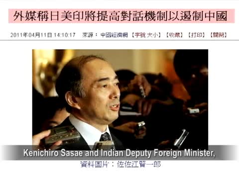 【新唐人2011年4月12日訊】日本《共同社》週一援引多名外交消息人士的話報導說,日本、美國和印度三國已經達成協議,將於今年內,建立新的高階官級對話框架,討論區域局勢的安全問題等。主要是分析和應對中共的動向。