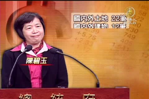 【新唐人亞太台2011年4月12日訊】日前爆發綠卡爭議的大法官被提名人陳碧玉,原來是個億萬富翁,根據監察院的財產申報資料,陳碧玉在台灣跟美國,都有多筆土地房屋,加上存款跟股票,身價超過1億3千萬,不過另一位被提名人黃璽君,名下卻只有1間房屋,甚至還負債95萬。