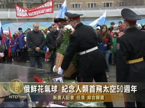 【新唐人2011年4月13日訊】4月12號(星期二),在俄羅斯首都莫斯科,人們用鮮花和氣球,在雨雪中紀念宇航員尤里-加加林(Yuri Gagarin),實現人類太空飛行50週年。