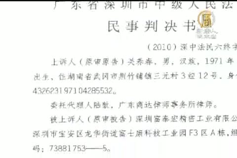 關養春的官司最後敗訴了,終審法官在法庭上還送給關養春一句話:給人打工,就應該認清自己的身份!關養春表示,富士康作業員的勞動力度大,主管的心理壓力大,他還曾勸阻成功想跳樓的同事。