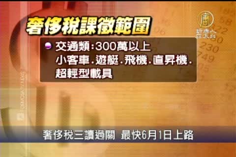 【新唐人亞太台2011年4月15日訊】新聞一開始,帶您來看到,在朝野黨團都有共識的情況下,立法院今天(15日)三讀通過「特種貨物及勞務稅條例」草案,也就是俗稱的奢侈稅。未來兩年以下移轉買賣的不動產,將加徵10~15%的奢侈稅,另外超過一定額度以上的交通工具和奢侈品,也要課稅,最快6月1日就會上路。