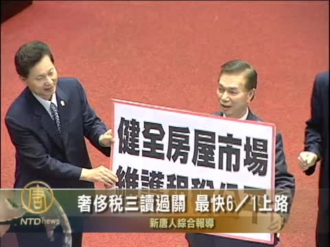 【新唐人2011年4月16日訊】在台灣朝野黨團都有共識的情況下,立法院15號三讀通過草案,也就是俗稱的奢侈稅。未來兩年以下移轉買賣的不動產,將加徵10~15%的奢侈稅,另外超過一定額度以上的交通工具和奢侈品,也要課稅,最快6月1日就會上路。