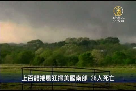 【新唐人亞太台2011年4月17日訊】美國南部各州連日來遭到暴風雨和上百個龍捲風侵襲,其中密西西比州14郡、奧克拉荷馬州26郡及阿拉巴馬州都已經宣布進入緊急狀態,死亡人數還在不斷攀升, 目前已知有26人罹難。而風暴所帶來的雨量也讓許多州出現水災,其中北達科他州和明尼蘇達州因水位上漲,造成公路和農場被淹沒。美國國家氣象局人員表示,暴風雨未來將會朝南、北卡羅萊那州和維吉尼亞州東南部移動。
