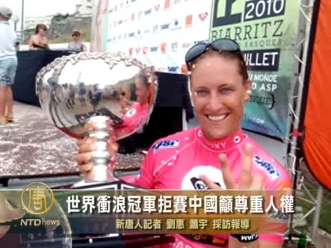【新唐人2011年4月18日訊】世界女子衝浪冠軍寇裡.舒馬赫,抵制今年下半年在中國海南舉行的國際比賽,以抗議中國人權劣跡﹔對此婦女權益組織對她的正義之舉表示讚揚。中國學者則鼓勵更多的運動員站出來表達正義的聲音。