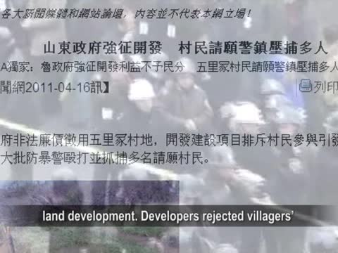 魏先生(山東德州市棗農):「一畝地三萬塊錢,你不要也不行,公檢法都來對付你,你不願意就把你的樹一夜之間拔光,甚麼也不管,(居民)就跟狗一樣無保障,三無!我們現在的人都是三無。都在徵地、開發啊!蓋商品樓。」。