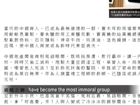 文章說:當代的中國商人,已成為最無道德的一群,賣木耳的用福爾馬林浸泡,賣火腿的用敵敵畏燻製,賣食鹽的用工業鹽充數,賣黃鱔的給黃鱔餵避孕藥,水銀魚、三聚氰胺奶粉、石灰麵粉、神奇牛肉、地溝油、染色饅頭,這些化學食品接二連三出現,使中國人再度成為新時代東亞病夫。