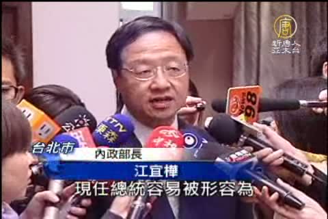 【新唐人亞太台2011年4月20日訊】新聞一開始帶您來看,總統立委併選已經拍板定案,選舉日期很可能就在明年1月14日,但距離總統5月就職, 中間長達4個月,在野擔心,會造成台灣史上最長的憲政空窗期,內政部長江宜樺回應,現任總統的確可能暫時「跛腳」,不過如果有職務交接條例,情況將會改善。