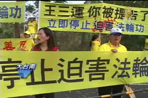 【新唐人亞太台2011年4月21日訊】除了早上在新竹被抗議迫害人權外,安徽省長王三運今天(21號)下午率團前往台南走馬瀨休閒農場時,也遇到法輪功學員舉橫幅,要求停止迫害,有市議員更是到現場發聲,表示不歡迎人權惡棍,請看來自台南的報導。