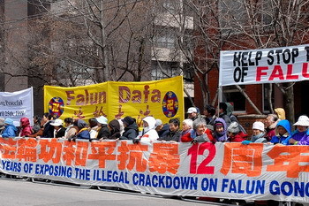 4月23日,大紐約地區和來自美東波士頓的法輪功學員在法拉盛冒雨舉辦了大型的遊行和集會,紀念4.25和平上訪12週年。法拉盛一直在下雨,很多民眾還是聚集在道路兩邊,觀看遊行。