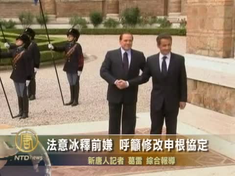 【新唐人2011年4月27日訊】4月26日,法國總統薩爾科齊與意大利總理貝盧斯科尼會面。兩人發出改善兩國關係的積極信號,並表示需要改革“申根協定”,限制湧入歐洲的非法移民。