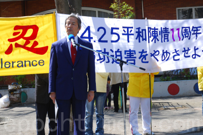 「四.二五」12週年之日,數十名法輪功學員聚集在大使館前和附近公園內,打出「不解體中共,迫害就不會停止」等日語和中文橫幅,呼籲正義良知,解體中共,停止迫害。