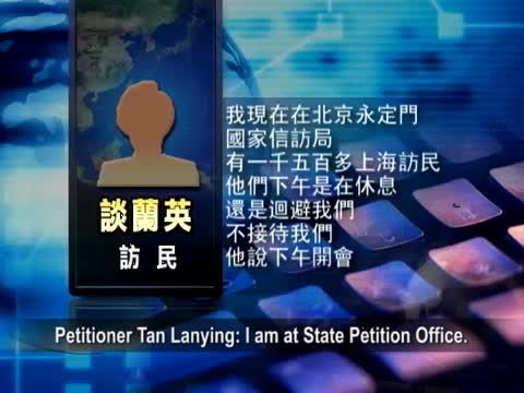 訪民談蘭英:“我現在在北京永定門國家信訪局。北京有一千五百多上海訪民,他們下午是在休息還是迴避我們?----不接待我們!他說下午開會。我們上午就來了,要接待。訪民的(房子)政府把房子搶走了,所以我們要跟它講,跟它討個公道,現在挺多人的,人山人海。”