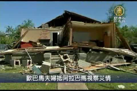 【新唐人亞太台2011年4月30日訊】美國中南部多個州受到一連串的龍捲風襲擊,星期五(4月29日),美國總統歐巴馬和第一夫人蜜雪兒搭乘空軍一號抵達災情最嚴重的阿拉巴馬州視察。到29號前為止,這次風災已經造成324人死亡,是美國近四十年來最嚴重的龍捲風災害。