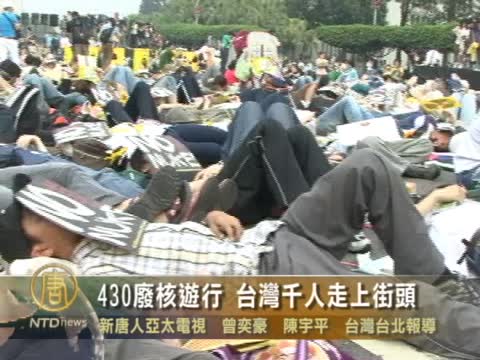 【新唐人2011年4月30日訊】週六(4月30日),台灣環保團體發起向日葵廢核遊行,數千位民眾走上臺北街頭,再次向政府表達廢核的訴求。遊行隊伍下午兩點從國父紀念館出發,最後來到總統府前,高舉「NO NUKE」的標語,並在凱道上演出行動劇,模擬大型核災發生的狀況。希望政府能重視人民的心聲,實現非核家園。