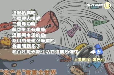 上海市民張先生:「這麼多年吧,甚麼瘦肉精呢、三鹿毒奶啊, 蔬菜裡面有農藥,這個河水裡的魚 都知道用的是避孕藥餵的,食品問題多了 , 老百姓每天都生活在這個恐懼中。」