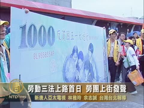 【新唐人2011年5月2日訊】今天是五一勞動節,勞動三法也正式上路,不過和往年一樣,勞工朋友今天走上街頭,表達訴求,光是臺北市就有好幾場勞工遊行,聚焦加薪、失業率和反過勞議題。