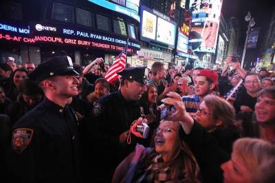 現在是5月2日凌晨1點半,還是有很多人聚集在紐約的時代廣場。他們揮舞著美國國旗、唱著美國國歌、慶祝美國在反恐戰爭中取得的重大進展。