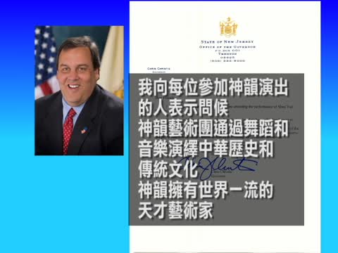 新澤西州長克里斯蒂(governor Christie)致賀信,對神韻藝術團為恢復中華文化做出的貢獻表示敬意。信中說: “我向每位參加神韻演出的人表示問候。神韻藝術團通過舞蹈和音樂演繹中華歷史和傳統文化。神韻擁有世界一流的天才藝術家,並在全球最具盛名的舞臺上表演。我對所有參與神韻以保持傳統文化的人表示嘉獎。”