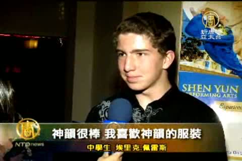 中學生 埃裏克.佩雷斯( Eric Prez):「我們來自一所中學,我們學習漢語。我們老師告訴我們神韻,我們想來。我們來了二十人,加上老師二十二人。神韻很棒。我喜歡神韻的服裝,我喜歡演出表現出的活力,我喜歡舞蹈,我喜歡演唱,我喜歡神韻的一切。」