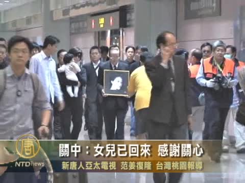 【新唐人2011年5月8日訊】考試院長關中夫婦帶著女兒關雲娣的遺體今天(7日)搭機回台,夫妻在移靈過程中數度哽咽痛哭,關中說,女兒已經回來,希望事情告一段落,不要再勞動大家。