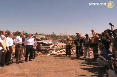 4月29日星期五 歐巴馬和第一夫人視察了被龍捲風襲擊的阿拉巴馬州塔斯卡盧薩,會見了阿拉巴馬州州長,地方政府官員,和受災民眾。總統訪問了侯特小學,察看了救援行動的實施情況。
