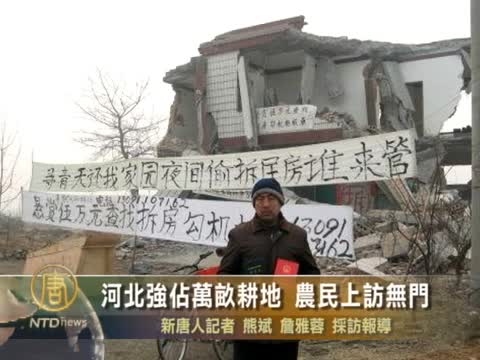 【新唐人2011年5月10日訊】中國河北邯鄲市馬頭生態工業城城南辦事處,自2008年以來違法強佔黃鼠村、杜村等14個村農民耕地超過一萬畝,並侵佔土地補償款,還動用警察和黑社會人員鎮壓,有護地農民郭志方被活活打死,農民上訪和打官司也遭到阻撓。