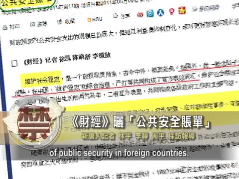 【新唐人2011年5月11日訊】前不久,《法國國際廣播電臺》對中國6244億元的的天價「維穩費」進行報導,招來了中共媒體《新華網》的猛烈攻擊,並聲稱中國只有“公共安全支出”,沒有“維穩費”。不過,大陸媒體《財經》雜誌,最近又把中共的公共安全帳單曬了出來,間接證實了《法廣》的報導。