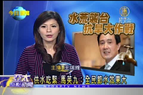 【新唐人亞太台2011年5月11日訊】新聞一開始,帶您來關心,台灣各地民生用水持續拉警報,那麼為了呼籲全民共同節水抗旱,總統兼國民黨主席馬英九,今天(11日)下午在國民黨的中常會上說,自己曾經在台北市長任內,為了求雨還願,有三到四年的時間,都將洗澡完的水留下來沖馬桶,他藉此來呼籲大家做好節水的工作,而在今天傍晚,總統府則是舉行抗旱國安級會議,馬總統後天(13日)也會到石門水庫,來實際瞭解缺水的情況。