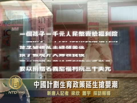 【新唐人2011年5月12日訊】最近有大陸媒體曝光了湖南邵陽,計劃生育官員搶奪嬰兒賣到國外的聳人聽聞事件,孩子先被送入福利院,全部改姓邵,因此被稱為「邵氏孤兒」現象。然而據國務院一位專家透露,此非單一事件,這是計劃生育政策的又一惡果。