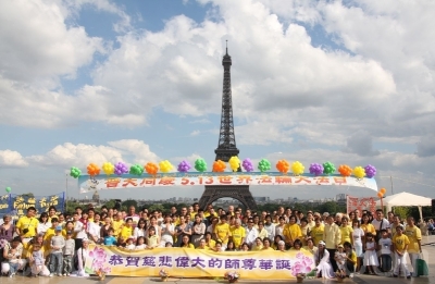 【新唐人2011年5月12日訊】1995年李洪志先生在法國巴黎,首度向海外傳授法輪大法,法輪功也從此在法國生根發芽。每一年的世界法輪大法日,法國的法輪功學員都會彙聚在巴黎埃菲爾鐵塔前的人權廣場上,歡慶這一珍貴的日子。