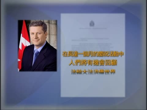【新唐人2011年5月13日訊】在法輪大法日即將到來之際,全世界的法輪功學員和支持者們都在共同慶祝法輪大法傳世19週年。今天,加拿大總理哈珀和多位聯邦政府部長分別發出賀信,讚頌法輪大法真善忍的理念,感謝法輪功學員對社會的貢獻。