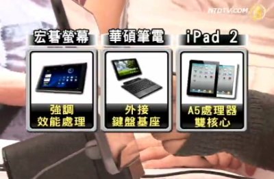 除了影音遊戲外,各家廠商也推出自己的風格,像是宏碁10吋螢幕,就強調效能的處理﹔華碩則是以可外接鍵盤基座,組成10吋筆電﹔9.7吋的iPad2使用了A5處理器,除了具備雙核心,繪圖處理速度是前一代A4的九倍。(需圖卡)