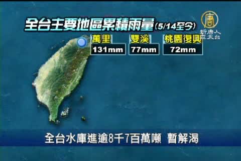 【新唐人亞太台2011年5月15日訊】新聞一開始,首先帶您來關心,台灣的旱象是不是已經獲得緩解。梅雨鋒面持續為全台帶來降雨,經濟部水利署公布,連續3天的降雨為全台水庫進帳大約8700萬噸。但氣象局指出,這幾天降雨集中在北部、東北部地區,中南部水庫的進帳有限。不過,所幸16號鋒面就會南移,應該可以為南部再降下不少雨量,幫中南部水庫解渴。