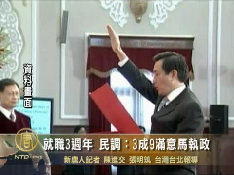 【新唐人2011年5月17日訊】中華民國總統馬英九即將就任滿三週年的前夕,台灣智庫公布了最新民調,結果有3成9的受訪者對馬政府執政感到滿意,有5成6的民眾不滿意,比起三年前得到近六成的選票支持,馬總統的執政滿意度退步許多。學者分析,2012總統大選,內政問題將是朝野參選人的一大挑戰。