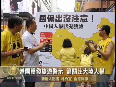 【新唐人2011年5月18日訊】由香港記者協會、國際特赦等多個人權團體組成的中國境內各省外游警示小組,日前舉行關注中國人權狀況藝墟,對大陸地區發出旅游警示,提醒港人注意人身安全,並繼續聲援大陸藝術家艾未未。