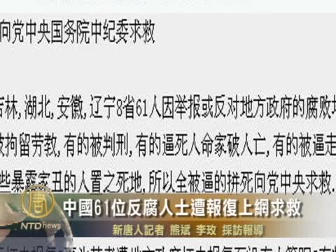 【新唐人2011年5月24日訊】中國8個省61位反腐人士,近日聯名在網上求救,他們都是因為舉報地方政府貪污腐敗而遭到打擊報復,有的被開除公職、有的被拘留勞教、有的被毆打致殘,過著飢寒交迫,提心吊膽的日子,他們希望外界對此給予關注。