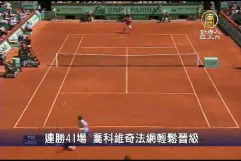 【新唐人亞太台2011年5月26日訊】星期四,法網公開賽進入第四天,在男單第二輪上,喬科維奇擊敗羅馬尼亞老將漢內斯庫,拿下第41連勝,晉級第三輪。