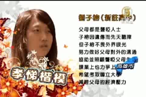 【新唐人亞太台2011年5月26日訊】每年五月是孝親家庭月,高雄市100年度學生孝悌獎得主出爐,今年有24名學生當選孝悌楷模,成了現代版的24孝,其中有好幾位同學都是父親或母親臥病在床,他們不但要照顧重病的雙親,還要充當父母,照顧年幼弟妹,孝行令人感動。