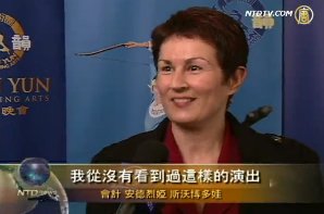 會計安德烈婭‧斯沃博多娃:「演出非常正面,美不勝收,我從沒有看到過這樣的演出,我願意把神韻介紹給所有人,讓人人都來看神韻。因為神韻不同尋常,不是一個普通的演出,非常特別……演出給我留下了美好的印象,美麗精緻的服裝,一切都美好優雅,令我魂牽夢縈,我會做夢再夢見神韻的。在當今匆忙而緊張的時代,神韻帶給人無比美好的感受,如同心靈的慰籍。」」