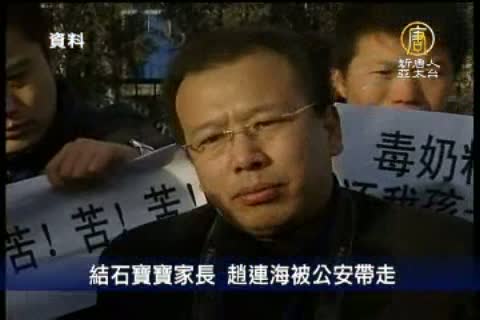 【新唐人亞太台2011年5月27日訊】當台灣的塑化劑風波越演越烈的同時,也帶您來關心,之前大陸三聚氰胺毒奶粉事件受害兒童的家長趙連海,星期四(26日)被公安帶走,根據BBS的報導,趙連海目前下落不明。「結石寶寶之家」發起人趙連海,星期四冒著再度入獄的風險,擺脫中共當局的監視,和數名毒奶粉受害家長及律師前往中國乳製品工業協會北京辦事處,要求協會交代被稱為「謎基金」的三聚氰胺毒奶粉賠償基金的運作情況。但協會以無事先預約為由,拒絕接見趙;趙連海隨後還被公安人員強行帶走。