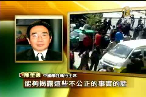 普林斯頓中國學社執行主席 陳奎德:「現在中國大陸群體性事件每年在增長,而且越演越烈,這個與它沒有一個保障老百姓一個是最基本的權利,及社會上最基本的公正,能夠有獨立的媒體能夠揭露這些不公正的事實的話,那麼這個情況會完全無法杜絕的。」