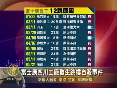 【新唐人2011年5月29日訊】富士康成都產業基地的一名20歲的男性員工,26日凌晨於郫縣德源鎮的公寓跳樓身亡,自殺原因不詳。當地公安在10分鐘後到達並封鎖現場。富士康的工作環境是否惡劣再次引起外界關注。