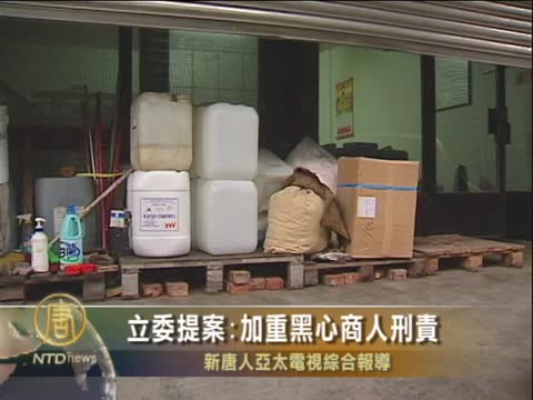 【新唐人2011年5月30日訊】臺黑心起雲劑波及範圍越來越廣,造成全民人心惶惶,黑心商人的罰責卻只有行政罰鍰,立委看不下去,提案修法加重刑責,尤其添加有毒物質致人於死,應處無期徒刑﹔運送、販賣者也得受罰,衛生署表示樂觀其成,但是立委也建議,衛生單位是否也該把素食納入檢驗範圍。