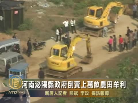 【新唐人2011年5月31日訊】中國河南泌陽縣農民在網上揭露,縣政府以每畝2萬7到3萬4的低價強佔數萬農民的一萬多畝土地,再以每畝300萬到90萬的高價倒賣給開發商,倒賣土地變成地方官員貪污受賄陞官發財的工具,而農民的生活卻從此陷入貧困。