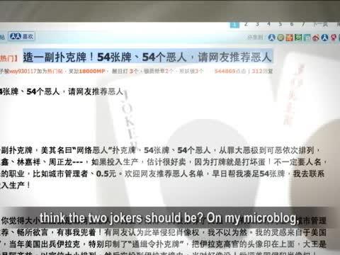 【新唐人2011年5月31日訊】大陸網絡一名網友突發靈感,想造一副“網絡惡人”撲克牌,從罪大惡極到可惡程度依次排列,54張牌、54個惡人。發起者呼籲大家趕快行動起來找惡人,製成撲克牌,打牌就是打壞蛋。民眾表示,早該「清算中共」。很多人紛紛舉報惡人。